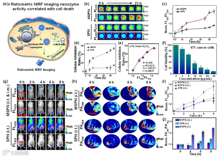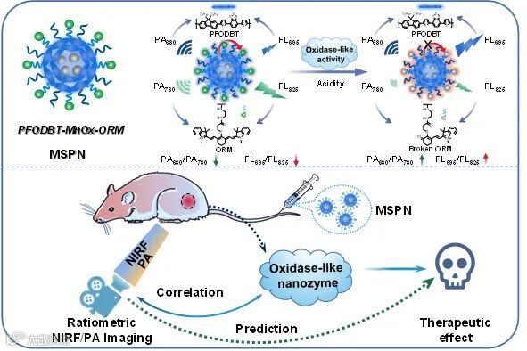 近日,湖南大学的宋国胜教授构建了一种具有类氧化酶活性的基于锰-半导体聚合物的智能纳米酶(MSPN)。该纳米酶不仅可以产生类氧化酶活性,用于被酸性肿瘤微环境激活的特异性癌症治疗。并且该纳米酶输出的比率型NIRF(FL695/FL825)-PA(PA680/PA780)双模信号与其类氧化酶活性密切相关。因此,该新型纳米酶可以通过双模比率型信号来实现对类酶活性的体内实时监控。因此,在本研究中报道的用于癌症治疗过程中纳米酶活性实时成像的纳米平台可能为评估其治疗效果和指导个性化治疗提供一种简便的策略,有望最大限度地提高癌症治疗的效果和尽量减少治疗带来的不良副作用。该论文的第一作者为滕丽丽博士和韩小雨硕士。