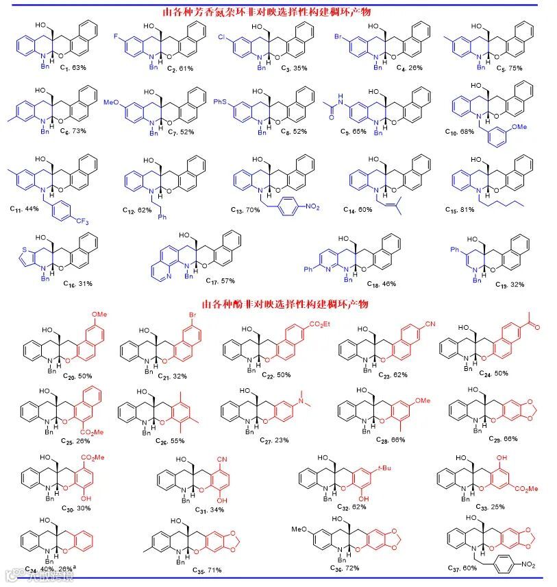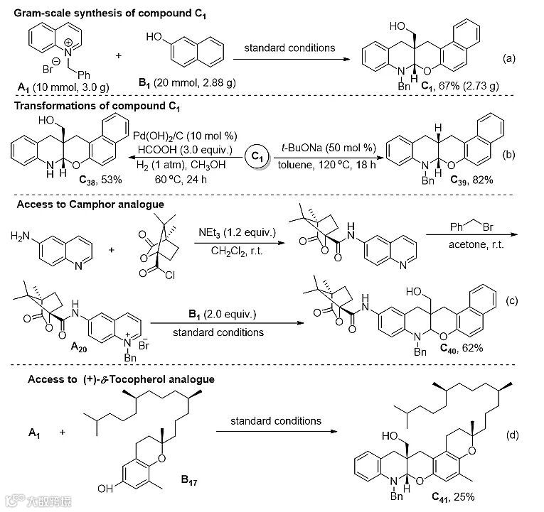 基于上述思想,作者发展了一种氮杂芳烃盐、酚、甲醛的多组分串联环化反应,以高非对映选择性(d.r. > 20 :1)合成了一类结构新颖的稠环化合物(图1c)。该方法具有底物适用范围广、官能团兼容性好、化学和区域选择性高、反应条件简单等特点(图2)。此外,所发展的合成方法可方便地克级合成稠合产物;而且,相关产物的N-烷基和β位的羟甲基可在温和的条件下进行消除,这为此类化合物的进一步衍生化提供了丰富的可能性;该合成法亦可对芳香氮杂环、酚类生物药物活性分子进行快速结构修饰(图3)。
