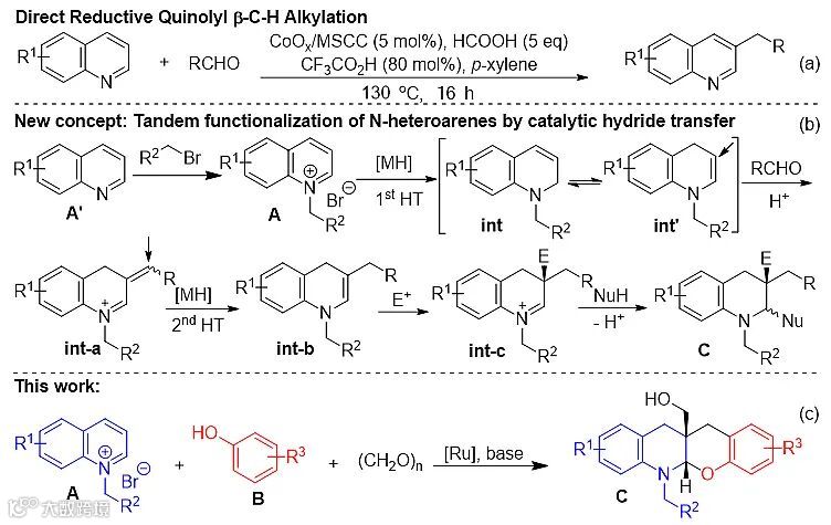 图1. 前期工作与氮杂芳烃的催化还原串联官能化构想