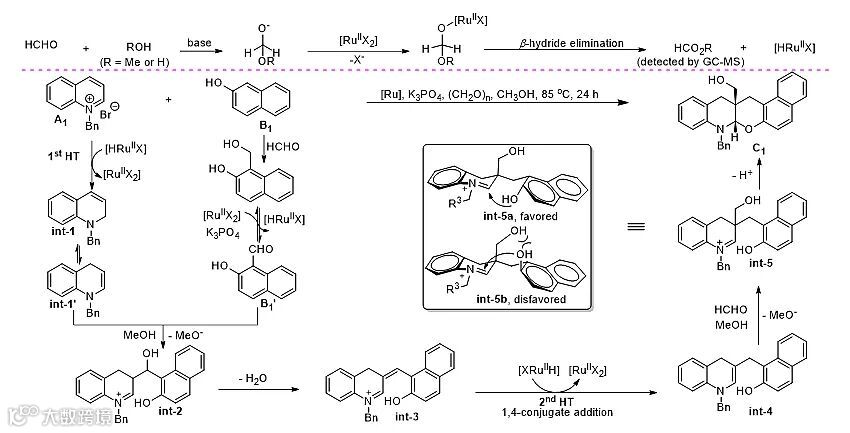 经控制实验和DFT计算等深入的机理研究,作者提出了可能的反应路径。如图4所示,首先溶剂甲醇或甲醇中的水在碱的作用下与甲醛加成得到半缩醛,在碱的作用下金属钌经阴离子交换和β-氢消除得到原性金属氢物种[HRuIIX]并放出甲酸甲酯或二氧化碳(GC检测)。金属氢物种[HRuIIX]对喹啉盐A1进行氢转移得到烯丙基胺int-1与其互变异构体烯胺int-1',同时酚B1与甲醛加成并在碱和钌催化剂的作用下脱氢得到2-羟基-1-萘甲醛B1'和[HRuIIX],随后int-1'对B1'进行亲核加成,int-2经脱水生成β-烯基亚胺int-3。紧接着,金属氢物种对int-3进行1,4-共轭氢转移得到烯胺int-4;int-4的β位捕获一份子甲醛生成羟甲基亚胺正离子int-5。最后在碱的作用下,int-5的酚羟基从羟甲基的反面对亚胺进行进攻,该模式因具有最小空间位阻而最为有利(见图4 int-5a vs int-5b),故反应得到顺式加成产物C1。值得一提的是,反应中生成的K2HPO4对int-5的酚羟基攫取质子的同时亦对四元环中间体的氧输送质子,故K2HPO4在反应中起到了“质子穿梭巴”的作用。