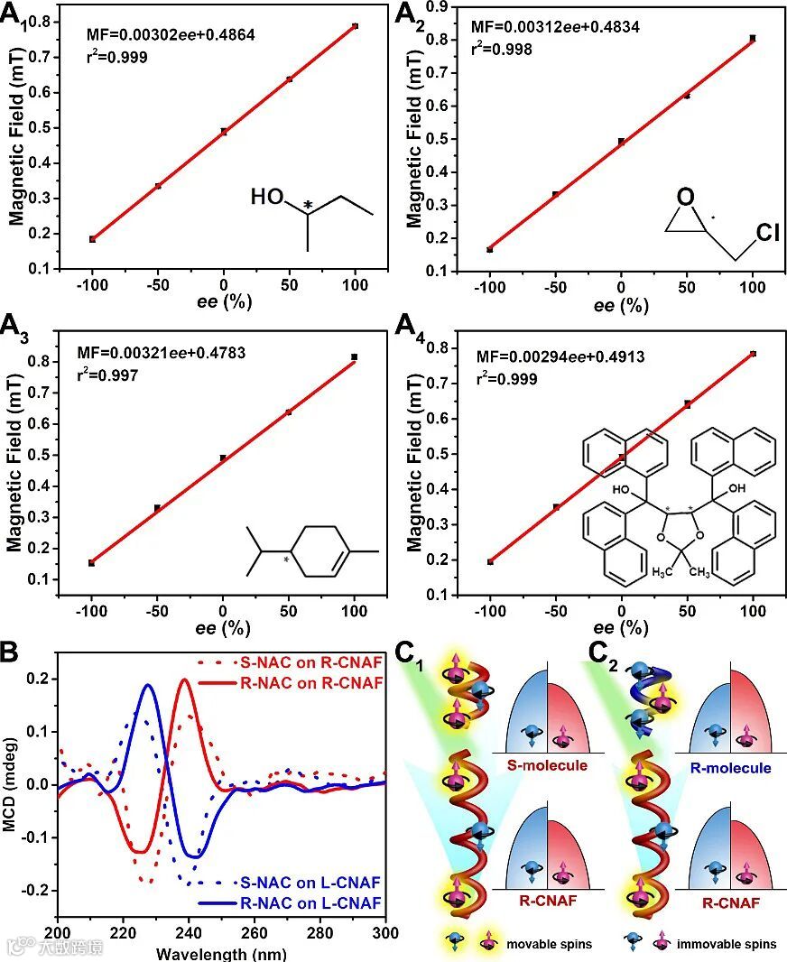 在磁场作用下,手性分子电子跃迁产生对圆偏振光选择性吸收,可能会引起手性分子的手性选择性自旋极化。因此当在CNAFs表面负载手性分子时,手性分子的自旋极化可能会与CNAFs的自旋极化产生手性选择性相互作用,从而影响CNAFs的磁场强度。且CNAFs的磁场强度很可能与手性分子的ee值相关,这为定量检测对映体ee值提供了一种新的思路。