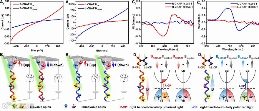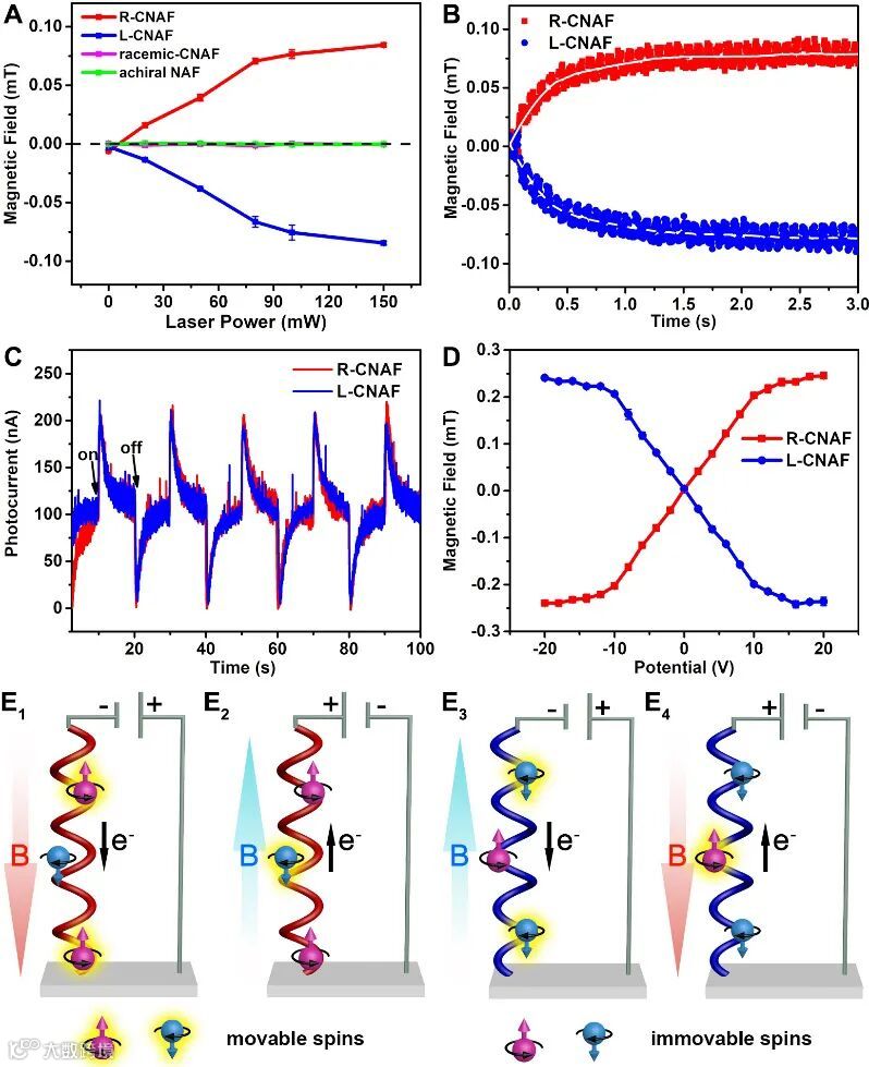 研究人员通过施加光照,发现相反手性的手性纳米结构金膜能够表现出大小相等、方向相反的磁场,这就是PM-ChA。由于电与磁总是相伴随存在,螺旋线圈通电有可能产生磁场。推测CNAFs的PM-ChA产生的原因可能是,在光照下CNAFs中产生光电流,电流沿着螺旋路径传播,产生磁场。研究人员通过电化学工作站探究CNAFs的光电流,发现相反手性的CNAFs在开启激光器时均表现出约150 nA的光电流,在保持激光器开启时出现缓慢的弛豫过程,关闭激光器时立即消失。将CNAFs引入电路并施加电势,当分别施加正电势和负电势时,R-CNAFs产生正和负磁场,L-CNAFs表现出与R-CNAFs相反的电磁现象。证明了CNAFs的光磁场的产生是材料中光电流运动的结果。