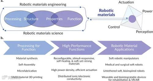 这里我们需要了解下什么是机器人材料。机器人材料是一个自成体系的材料系统,其形式和组成能够实现驱动、感知、动力和控制等多样分布式机器人功能。区别于响应性材料或者智能材料,以及大多数功能单一的软体机器人组件,机器人材料将会在机器的物理外在和智能计算方面建立桥梁,以提高其性能、实际使用和自主性。理想的机器人材料则期望可以在一个单一的材料系统中表现出所有的机器人功能。