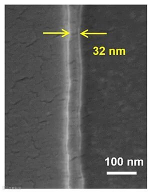 图1. 飞秒激光双光子DMD面投影曝光制备的聚合物线的SEM图像。最小线宽为32 nm,平均线宽为44 nm,标准偏差为4 nm,粗糙度为2〜3 nm。