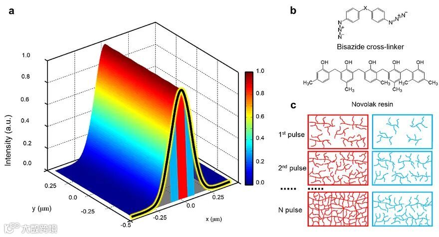 图2. 化学非线性与光学非线性协同作用原理。(a)单像素线线阵列光场分布。(b)非化学放大胶分子结构。(c)飞秒脉冲辐照下的逐步光聚合机理。