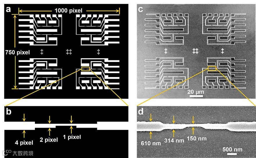 图3. 飞秒激光面投影制作跨尺度结构。(a)含有不同像素结构的掩模图形。(b)小像素部分的设计细节。(c)飞秒激光DMD面投影曝光制作的结构的SEM图像,其总尺寸为数百微米,同时包括线宽为150 nm特征分辨率。(d)小像素曝光的放大SEM图像。