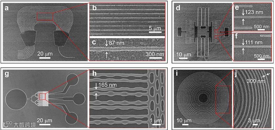 图4. 飞秒激光面投影制作各种跨尺度结构。(a)阵列波导光栅。(d)静电梳齿微谐振器。(g)微流道。(i)微尺度菲涅尔波带片。