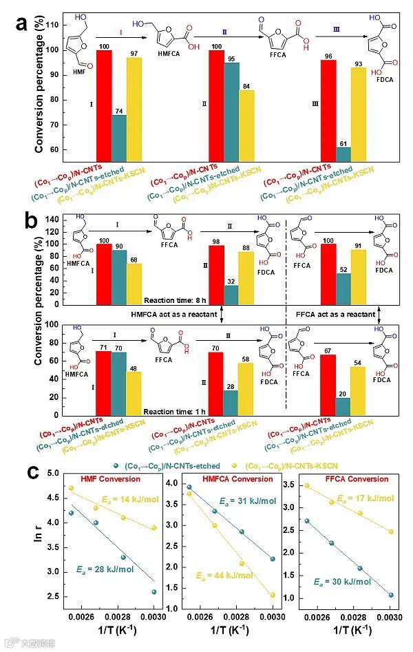 Figure 3. (a) Catalytic performance of (Co1→Cop)/N-CNTs, (Co1→Cop)/N-CNTs-etched and (Co1→Cop)/N-CNTs-KSCN for HMF oxidation. (b) Catalytic performance of (Co1→Cop)/N-CNTs, (Co1→Cop)/N-CNTs-etched and (Co1→Cop)/N-CNTs-KSCN for HMFCA and FFCA oxidation. (c) Arrhenius plots for (Co1→Cop)/N-CNTs-etched and (Co1→Cop)/N-CNTs-KSCN in oxidations of HMF, HMFCA and FFCA. The ln r values were calculated based on the product generation rate versus reaction time.