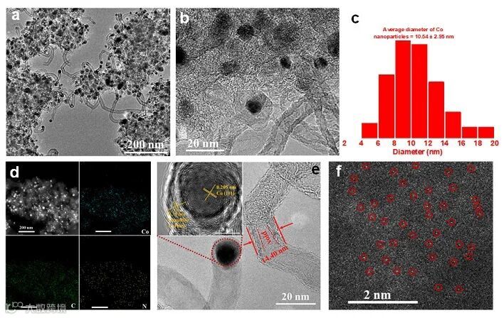 Figure 2. (a and b) TEM images of (Co1→Cop)/N-CNTs. (c) Co NP size distribution in (Co1→Cop)/N-CNTs. (d) HAADF-STEM image and corresponding element mapping images showing the distributions of (C (green), N (yellow), and Co (cyan) within the (Co1→Cop)/N-CNT catalyst. (e) HRTEM images of (Co1→Cop)/N-CNTs. (f) HAADF-STEM image of (Co1→Cop)/N-CNTs in the nanoparticle-free region, where single Co atoms are clearly seen.