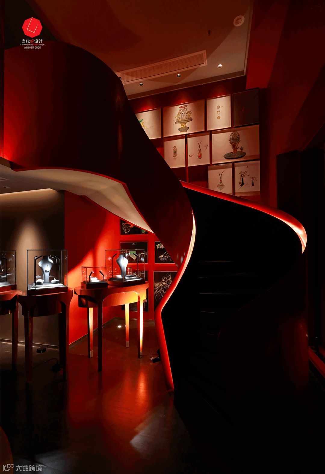 设计师删繁就简,舍弃非必要的饰材,以几何线条串连空间设施;色彩上采用鲜艳夺目的中国红,在整体幽邃的空间中盈透着疏离的格调,光影流转间柔化几何线条,与珠宝的奢华之美相互辉映。空间中中式留白意境与当代极简风格呈现出异曲同工的美感,在曲折回环间,勾起无穷想象。