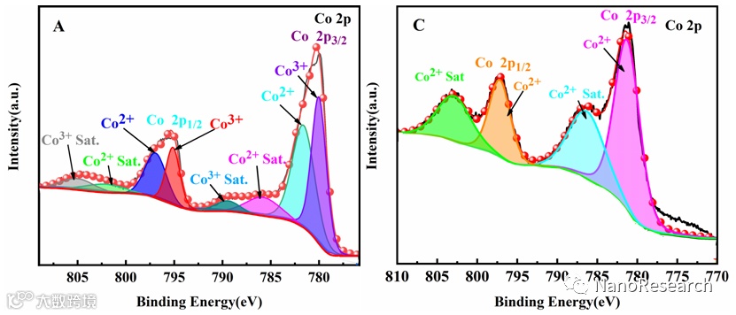 实验成功在原子级水平上研究了微观反应机制与宏观催化性能之间的构效关系。采用XPS、fs-TAS表征手段,得出二维纳米片表面存在大量氧空位缺陷结构, 进而研究了缺陷结构对微观反应内部载流子的产生、分离、复合过程的影响。结果如下:2D 超薄纳米片表面引入氧空位缺陷结构,打破了电子-空穴的动态平衡,构建出电子-空穴的非平衡状态,从而有利于电子聚集在空穴周围,形成“电子笼”效应,气相氧气进入氧空位缺陷内部通过捕获电子形成活性氧组份,进而与相对应块状Co3O4相比,改变了催化反应路径,降低了化学反应活化能,促进反应的进行。