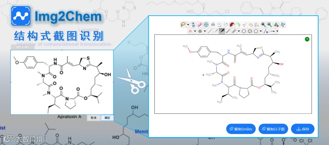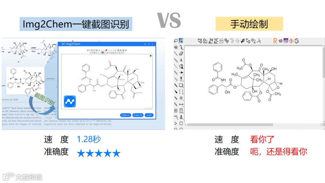 想高效绘制文献中结构式?试试Img2Chem吧!Img2Chem是一款通过OCR技术识别分子结构式的程序,具有简易舒适且毫无学习成本的操作模式,以及高速准确地识别化学结构式的特点。Img2Chem只需要点点鼠标就能1秒钟完成一个分子结构式的识别和输出整个过程,使绘制结构式走上“高速公路”!