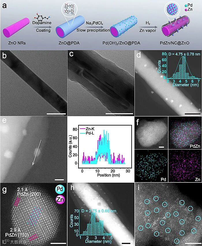 直接乙醇燃料电池 (Direct ethanol fuel cell, DEFCs) 在电力的产生、储存和转化等领域中具有广阔的应用前景,对于缓解当前的能源紧缺和环保压力等方面意义重大。高效低成本的乙醇氧化反应 (EOR) 电催化剂的研制是直接乙醇燃料电池研究的核心。将金属纳米粒子缩小到单个的金属位点被认为是提高电催化剂性能和成本效益的有效途径,但这并不适用于由多个位点或特殊活性中心催化的特定反应。目前,Pd与Zn、Ni、Sn、Co、Cu、Ge等贱金属 (M) 合金化,构建Pd-M双位点,比纯Pd位点更有利于EOR。这种双位点的优异活性通常被认为是贱金属调节钯的电子结构或协同参与反应的结果,这一模糊的作用原理已成为开发先进的EOR电催化剂的主要障碍。此外,为了提高双位点的暴露性和均一性以获得更好的EOR性能,通常采用溶剂热方法去合成小尺寸的金属间化合物,但该方法难以避免残留的表面活性剂覆盖双位点,从而影响在EOR中的性能表现。因此,开发有效的合成策略来构建暴露性和均匀性优异的Pd-M双位点电催化剂以实现高效的EOR过程,并阐明双位点的真实作用机制,这对于发展直接乙醇燃料电池研究的重要性不言而喻。