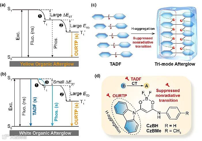 近日,南京邮电大学陈润锋教授课题组通过理性调控材料的激发态能级结构,提出了一种新型的三模式长余辉发光原理,实现了单组分的白光长余辉。作者利用二氟硼单元和商业化咔唑制备了具有三模式长余辉发光的材料(CzBH和CzBMe),该类材料具有较强的分子间相互作用,有效抑制分子的三线态激发态(T1)的非辐射跃迁;并且由于具有典型的给体-受体(D-A)分子结构,导致其具有较小的单三线态能级差(ΔEST);同时,利用H-聚集工程构建稳定的三线态激发态(T1*)。因此,同时实现了单线态(S1)、三线态(T1)和稳定三线态(T1*)的长余辉发光,其中S1和T1的余辉颜色为蓝色,T1*的余辉颜色为黄色,利用365nm的紫外光进行光照选择性的调节T1*的余辉强度,从而对材料的余辉颜色进行有效的调控,实现了单组分有机白光长余辉,余辉发光效率为14.1%,白光余辉颜色的CIE坐标为(0.32,0.32)。该工作为实现高效率的有机单组分白光长余辉提供了重要的研究思路。