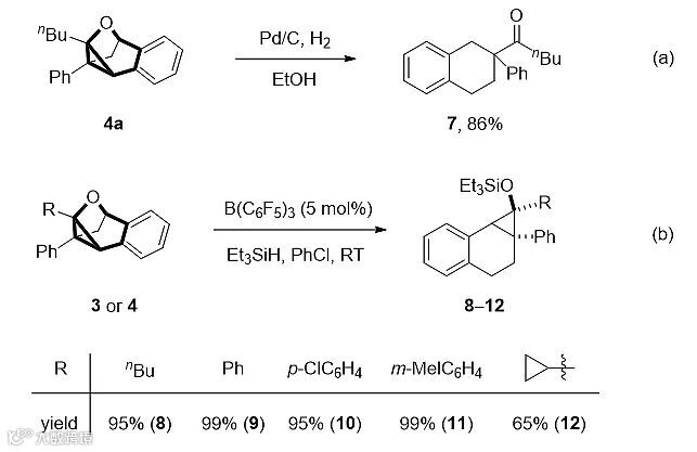 随后,课题组对反应的实用性进行了研究。在Pd/C催化氢化条件下,4a中的氧桥环和环丙烷都经历了裂解和开环,形成了带有季碳四元立体中心的四氢萘7(图8)。相反,当以B(C6F5)3为路易斯酸,以Et3SiH为还原剂,三环产物仅发生氧桥环的选择性裂解以良好至优异的产率得到多取代的带有硅氧基的环丙烷化合物8−12。众所周知,带有硅氧基的环丙烷化合物在有机合成中有着广泛的应用,它们是有价值的高能量的烯醇负离子的重要前体。