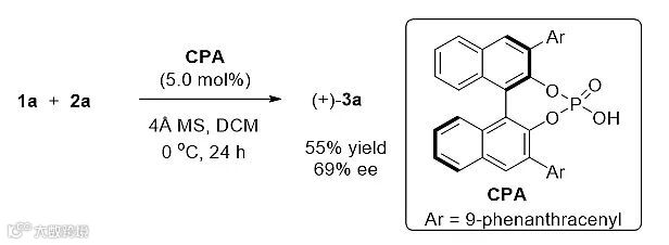 同时,由于反应由磷酸实现催化,作者希望使用手性磷酸催化使得反应可以对映选择性地构建产物,在多番尝试后他们发现,使用带有9-菲基取代的BINOL磷酸时,1a和2a可以以55%的产率,69%的ee值得到对映体富集的产物3a(图7)。