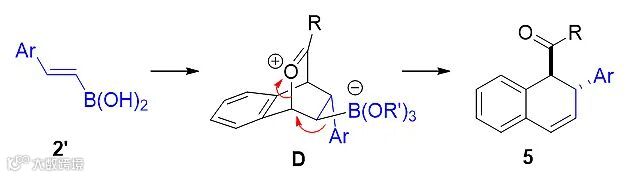 为了解释反应中非同寻常的碳碳键形成过程,作者提出了可能的机理:在酸的活化作用下,苯并异吡喃底物1会经历甲氧基离去基团的消除得到苯并异吡喃盐A,同时,离去的甲氧基活化硼酸形成硼化合物B。接着,活化后的中间体A和B发生[4+2]环加成反应得到关键的双环氧鎓盐中间体C,通常情况下,这类双环氧鎓盐的氧桥环会断裂,但在该反应中,该过程并没有发生,与而代之的是亲核的硼酸盐进攻氧鎓盐的亲电碳位点从而完成了碳碳键的构建,形成了最终的环丙烷张力环结构单元(图4)。作者认为,该过程实现了苯并异吡喃盐的新的反应性。在该机理下,也可以解释3-烷基取代的苯并异吡喃反应性较低的原因,相对于芳基来说,烷基不易稳定氧鎓盐,因此反应较难发生。此外,对于该反应,1-芳基乙烯基硼酸至关重要,若使用2-芳基乙烯基硼酸,反应将获得完全不同的二氢萘产物5,这表明烯基硼酸上芳基所导致的[4+2]环加成的区域选择性,对该过程也十分重要(图5)。最后,作者以二羰基化合物6为底物进行了控制实验。在标准条件下,其与2a也能以67%的产率形成产物3a(图6)。作者认为,在酸催化下6可以转化为6',从而得到苯并异吡喃盐中间体。