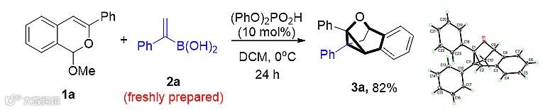 作者选用3-苯基取代苯并异吡喃底物1a与1-苯基乙烯基硼酸2a作为模板底物,通过大量的条件筛选得出最优反应条件为:10 mol%磷酸二苯酯为催化剂,二氯甲烷为溶剂,在0 ℃下反应,能以较好的收率得到目标产物3a(图1)。