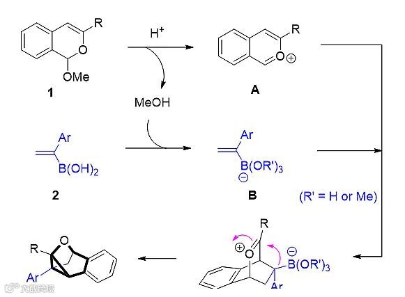 图5. 2-芳基乙烯基硼酸与苯并异吡喃盐的反应。图片来源:Angew. Chem. Int. Ed.