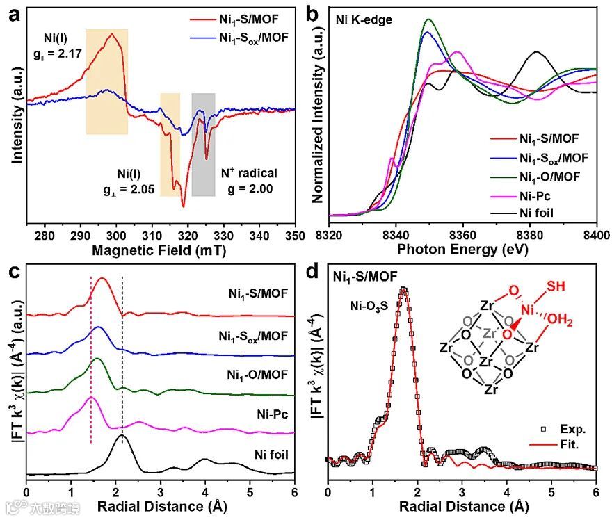 图2. (a) Ni1-S/MOF 及 Ni1-Sox/MOF 的 EPR 谱,(d) Ni K-边 XANES 谱,(e) FT-EXAFS 谱,(f) Ni1-S/MOF 的EXAFS 拟合结果。