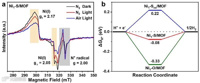 图4. (a) Ni1-S/MOF在不同测试条件下的EPR谱图,(b) Ni1-X/MOF光催化产氢的自由能计算结果。
