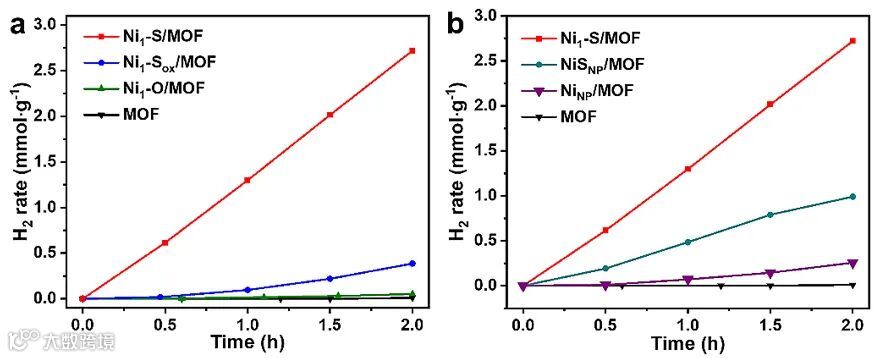 图3. (a) Ni1-S/MOF、NiSNP/MOF及NiNP/MOF光催化制氢活性对比,(b) Ni1-X/MOF光催化制氢活性对比。
