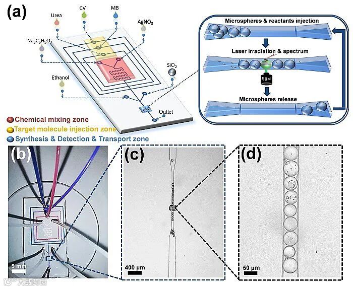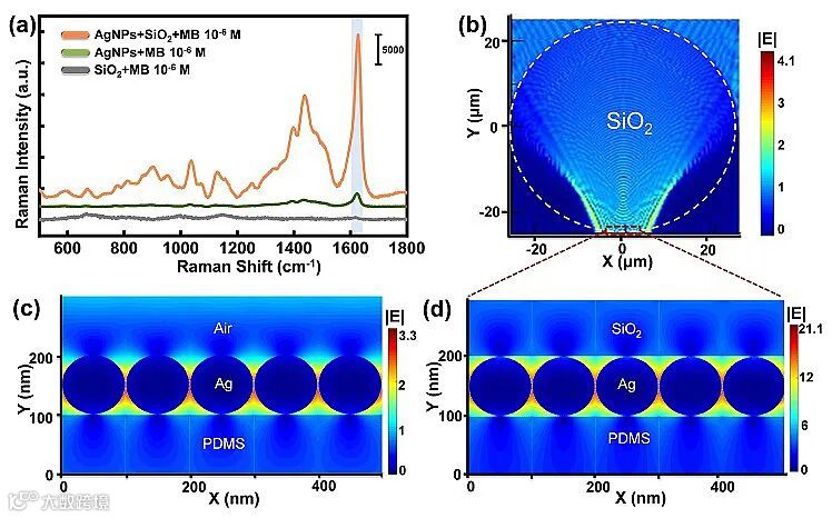 在这项工作中,开发了一种杂化光等离子体微流控输送器,输送可移动、高度有序的光等离子体微球到检测区域进行 SERS 检测。这种杂化光等离子体结合了Ag纳米结构中的表面等离子体和介质微粒(SiO2微球)中的光子,提供了超越传统等离子体和光子系统的奇妙光学特性。二氧化硅微球作为一种环保、经济、聚光的微结构,可以将光能量聚焦在光还原的Ag纳米颗粒附近,在微通道中产生巨大的电场增强,这是由FDTD模拟电场分布证实。
