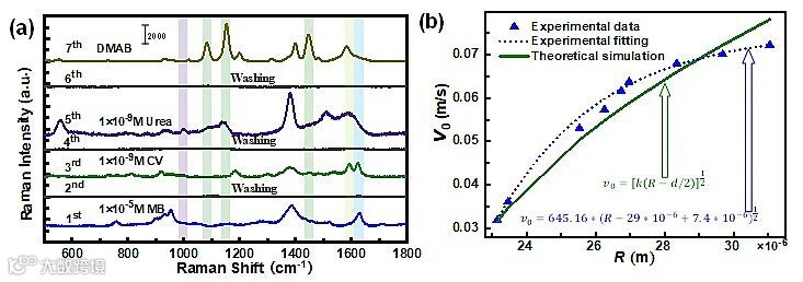 有趣的是,该工作通过调节注入流体的速度进而控制检测区域内的光等离子体微球的停止和释放,每个光等离子体微球就像一个独立的反应室,可以搭载不同目标分子,通过补给洁净的SiO2微球,从而实现在同一通道中进行多种分子的重复SERS 检测。在这个微型输送器中研究了运输光等离子体微球的动力学过程,并建立了的预测微球释放的理论模型。这些数据表明,作者的杂化光等离子体微流控输送器具有具有高 SERS 灵敏度的增强基底,可在批量检测中克服不同目标分子的交叉污染。