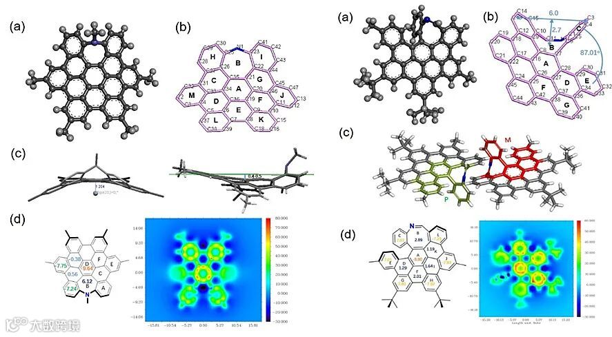 图2. 氮杂䓬(左)及吖辛因(右)嵌杂六苯并蒄结构及芳香性分析