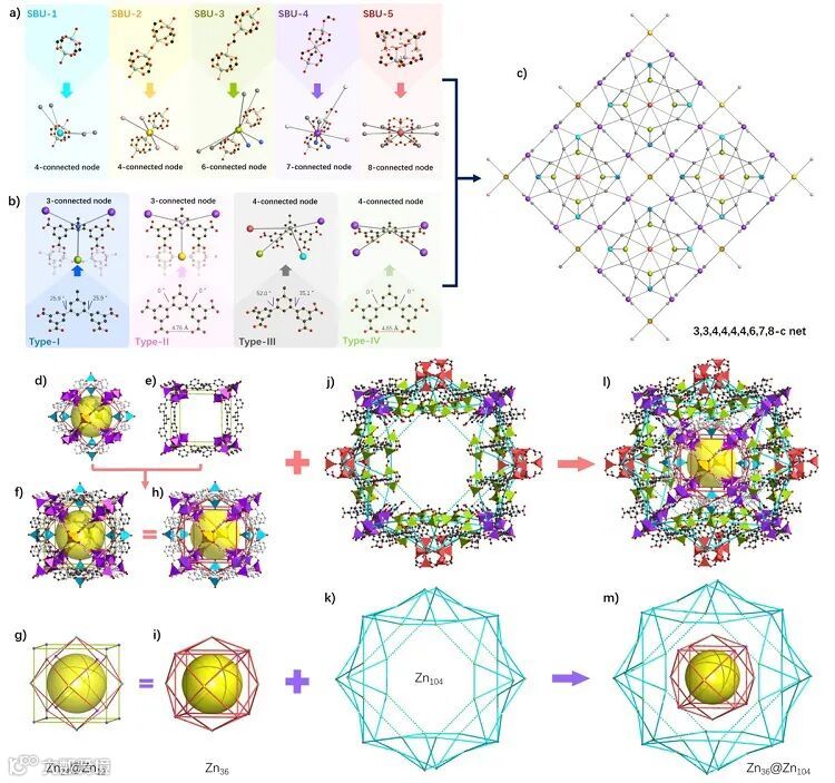 近日,河海大学卢治拥课题组基于5’-甲基-[1,1’:3’,1”-乙烯]-3,3’’,5,5”-四羧酸(H4MTPTA)配体,以Zn(II)作为金属结点,合成了首个含有六元组分的金属有机多面体框架材料(HHU-8,HHU = Hohai University)。如图1所示,该材料晶体结构最典型的特征为含有罕见双壁式笼型结构Zn36@Zn104,其中内笼Zn36为四角化立方体,它可进一步分解为菱形十二面体Zn24内核笼子(笼型孔腔的大小为13 × 13 Å2)和立方体Zn12包壳,外壳则由含有28 ×28 Å2内腔的Zn104组成,将内笼Zn36包裹其中。在该结构中,除了有机配体这一元组分以外,还包含了五元锌氧簇单元组分,即五种在几何学和组成上皆不相同的锌基次级构筑单元。同时,由于有机配体苯环二面角扭转衍生出四种具有不同构型的有机配体,与五种无机簇单元进行进一步的拓扑简化,可获得了具有拓扑独立性的九种节点,搭建出全新的具有3,3,4,4,4,4,6,7,8-连接的9-节点拓扑网络,拓扑符号为{4.62}4{42.613.86}8{43.63}20{44.611}4{44 .62}4{48.616.84}2{63}8{64.82}。该化合物突破了单一金属有机骨架材料中存在的无机次级构筑单元种类上限,将上限推高至五种,并且将同一拓扑网络中具有拓扑独立性的节点种类数上限推高至九种,对于进一步发掘金属有机骨架材料结构多样性以及无机构筑单元多变性具有积极的引导意义。更为深入的研究表明该六元组分金属有机多面体框架材料HHU-8的构建主要受甲酸控制,相关无机次级构筑单元的形成均系甲酸诱导而成(图2),同时,进一步地乙酸替换能促进额外金属离子的内嵌,从而完成金属氧簇结点的进化,获得更具机械稳定性的同网格化合物HHU-8s(图3)。该研究成果的意义在于不仅实现了单一金属有机框架材料内无机次级构筑单元种类的突破,还在于进一步增强了无机次级构筑单元的可控性构建,这对于金属有机骨架材料无机端的同网格合成具有一定的示范作用。