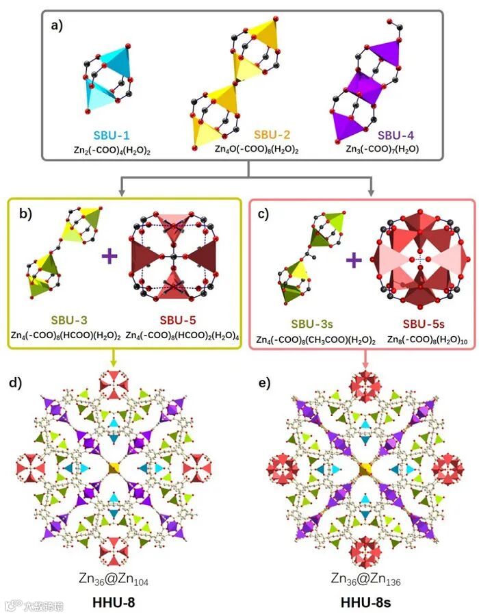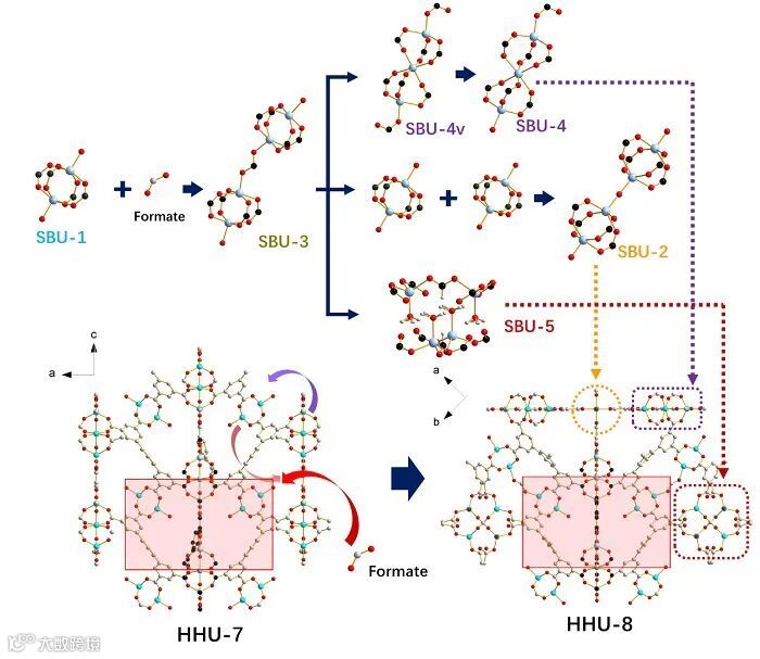 图2. 甲酸诱导次级构筑单元成型并进一步构筑获得HHU-8