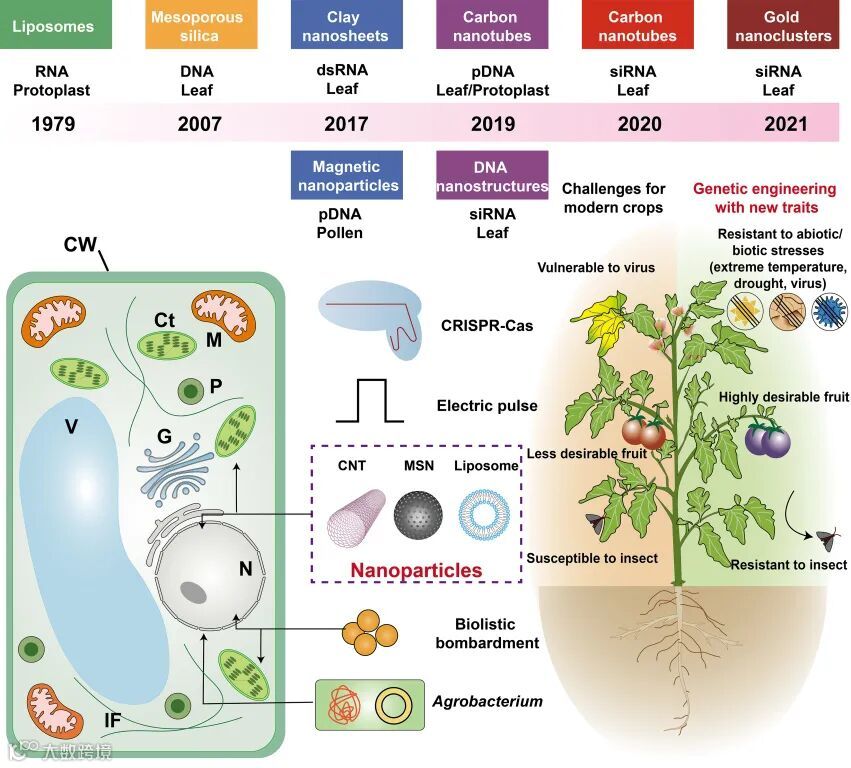 植物基因工程是定向改造植物遗传性状、实现植物精准育种的有力手段。在气候变化和人口增长的情况下,植物基因工程技术将在改善作物的产量、品质和抗逆性方面表型出突出的优势。而如何高效地将外源基因导入到植物细胞,是植物基因工程技术的关键。传统的转基因技术体系(农杆菌转化、基因枪等)具有高度的物种依赖性,且费时费力。近年来兴起的纳米材料介导的外源基因递送技术,有望克服这些缺陷,显著提高植物遗传转化的效率。