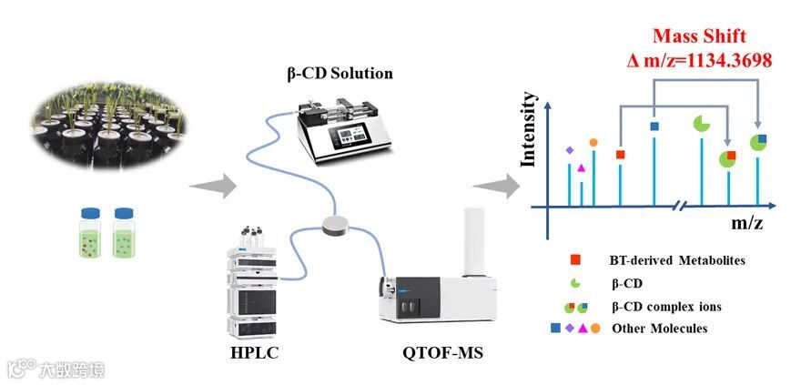 基于有机污染物在植物体内难以发生深度降解的特点,中山大学欧阳钢锋、徐剑桥研究团队针对有机污染物在代谢过程中保留的特征结构单元,首次提出了一种与HPLC-HRMS联用的非共价标记策略,并将其成功应用在苯并三氮唑(BT)的植物代谢产物鉴定中。针对BT在代谢过程中保留的特征结构单元,作者选择了具有疏水空腔的环糊精(CD)作为非共价标记试剂。与非标记组相比,被CD非共价标记后形成的复合离子表现出显著的质荷比位移,从而有效地降低生物基质中共存的内源性物质的干扰。