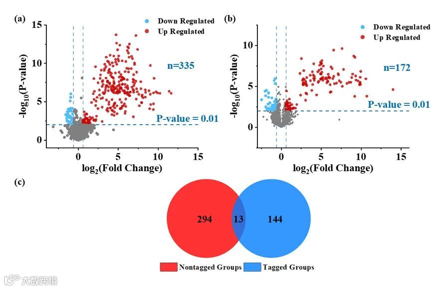 图2. (a) 非标记组和 (b) CD标记组在负模式下的火山图。(c) Venn图。红色和蓝色部分别代表未标记组和标记组中显着上调的特征数量。