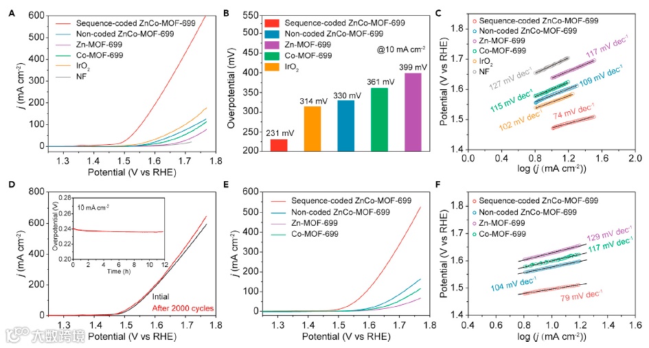 (A) LSV曲线; (B)过电势; (C) Tafel曲线; (D)序列编码ZnCo-MOF-699的电化学稳定性测试; (E-F)玻碳电极上不同电催化剂的LSV曲线及Tafel曲线比较。
