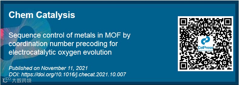 2021年11月11日,武汉大学化学与分子科学学院邓鹤翔教授、丛恒将副教授团队,在Cell Press细胞出版社期刊Chem Catalysis发表了题为“Sequence control of metals in MOF by coordination number precoding for electrocatalytic oxygen evolution”的研究成果,报道了一种“配位数预编码”的合成转化策略,成功实现了多组分金属有机框架材料(MTV-MOF)中层板金属序列交替排列的原子精准控制,序列编码后的MOF材料在电催化析氧反应中展现出最佳性能。武汉大学化学学院硕士研究生贾宏男、韩琦为该工作的共同第一作者,论文其它作者还有武汉大学化学学院罗威教授。