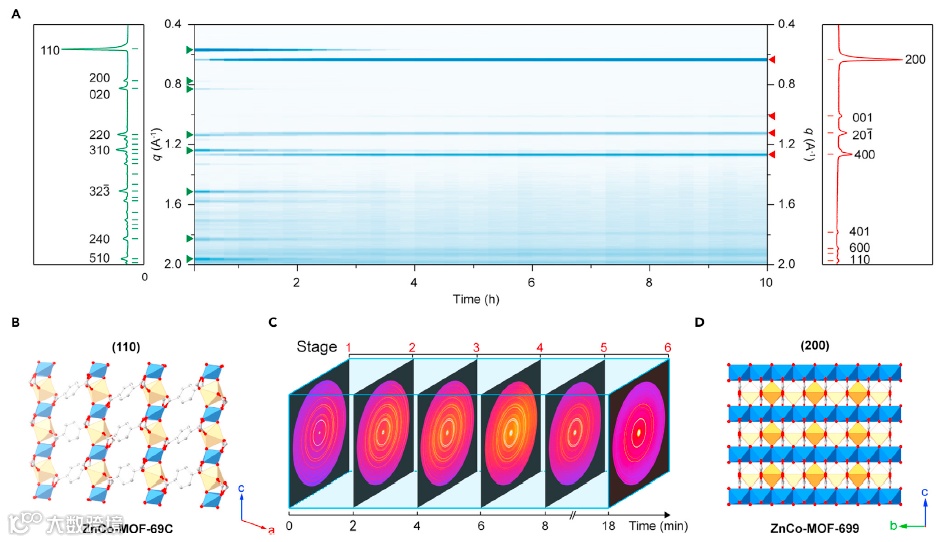图3. 时间分辨小角X射线散射实验阐明了单晶-单晶转化的机制。
