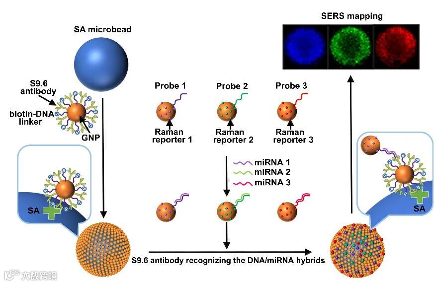 近日,陕西师范大学刘成辉教授研究团队发展了一种以单个微球为信号富集载体,基于单微球表面增强拉曼散射成像技术(SERS mapping)的多重microRNA检测方法(图1)。该方法中,作为反应载体的单个微球表面结合了一层标记有S9.6抗体的金纳米颗粒(GNPs),用于靶标microRNA的富集和信号增强。同时,体系中还设计了另一种SERS GNPs,其表面同时标记有与特定microRNA互补的单链DNA探针以及特定的拉曼信号分子(Raman Reporter)。SERS GNPs表面的单链DNA和目标microRNA通过互补杂交形成DNA/microRNA杂合双链,并被S9.6抗体特异性识别,从而将SERS GNPs及其负载的拉曼信号分子引入微球表面。通过上述反应,目标microRNA的种类和含量信息被成功转换为微球表面相应的SERS编码信息。