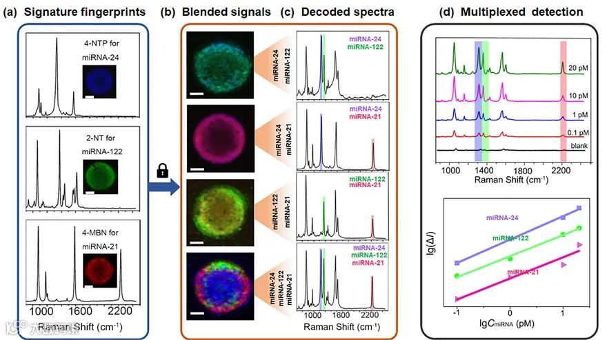 与荧光标记方法相比,SERS具有半峰宽窄、抗光漂白等特征,在多靶标的同时标记方面具有显著的优势。作者进一步结合SERS优异的多组分编码特性及S9.6抗体对DNA/microRNA的非序列依赖性识别能力,在单个微球表面实现了多种microRNA的同时检测(图3)。在该过程中,多种SERS GNPs被组合使用,每种SERS GNPs负载有针对不同microRNA靶标的DNA探针和特定的拉曼信号分子。因此,靶标microRNA会将相应的SERS GNPs及其负载的SERS编码信息引入单微球表面。随后,通过对获取的混合拉曼光谱进行编码拆分以及监测特征拉曼峰信号强度即可获得靶标microRNA分子的种类和含量信息。本论文的设计为多种microRNA分子的简便、快速、灵敏检测提供了新的方法,也为拉曼技术的分析检测应用提供了新的思路。