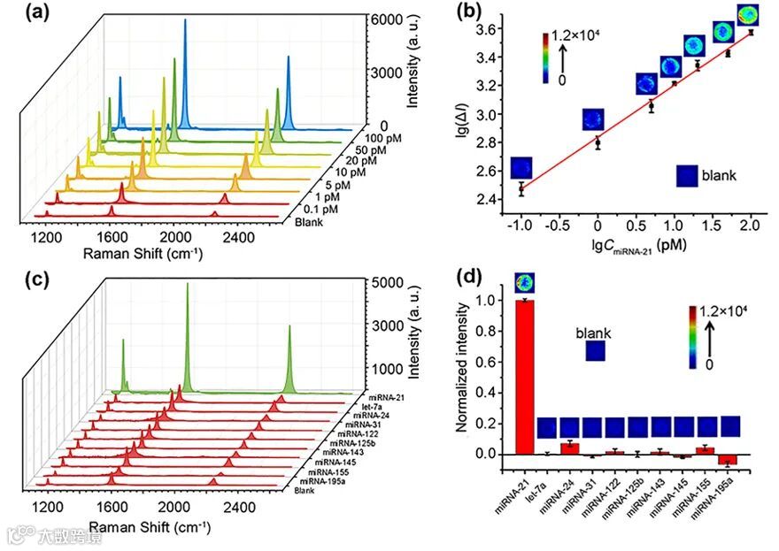 图2. 对miRNA-21的检测结果和分析性能。(a, b)不同浓度miRNA-21产生的响应信号及对应的校准曲线;(c, d)特异性验证;(b)和(d)中的内嵌图为单微球SERS成像图。