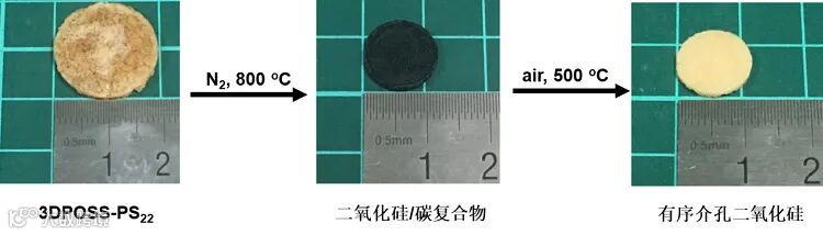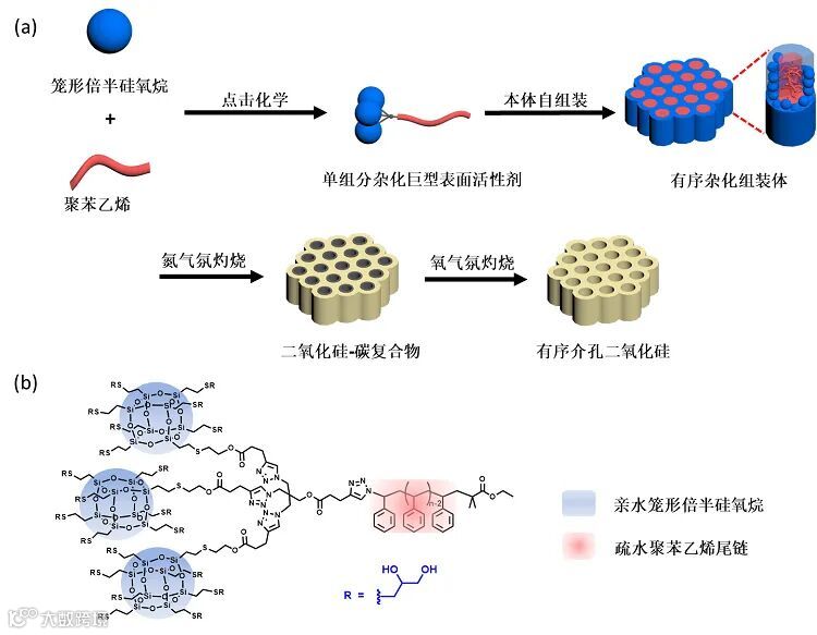 图1 以基于笼形倍半硅氧烷的巨型表面活性剂为前驱体制备有序介孔二氧化硅材料。图片来源:J. Am. Chem. Soc.