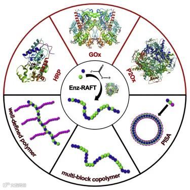 在众多新兴RAFT技术(包括光调控RAFT聚合技术、阳离子RAFT聚合、氧化还原引发RAFT聚合、酶催化介导RAFT聚合)中,酶催化介导RAFT聚合技术因其高选择性、高效率、反应条件温和、无需隔绝氧气和绿色环保等特点得到深入研究和广泛应用。这篇综述首先介绍了目前应用最广泛的运用葡萄糖氧化酶(GOx)、辣根过氧化物酶(HRP)、吡喃糖氧化酶(P2Ox)介导的RAFT聚合技术的现状和特点。之后论述了酶催化介导的RAFT技术在聚合物精准构建、超高分子量聚合物制备、嵌段共聚物制备以及聚合诱导自组装方面的研究与应用进展。