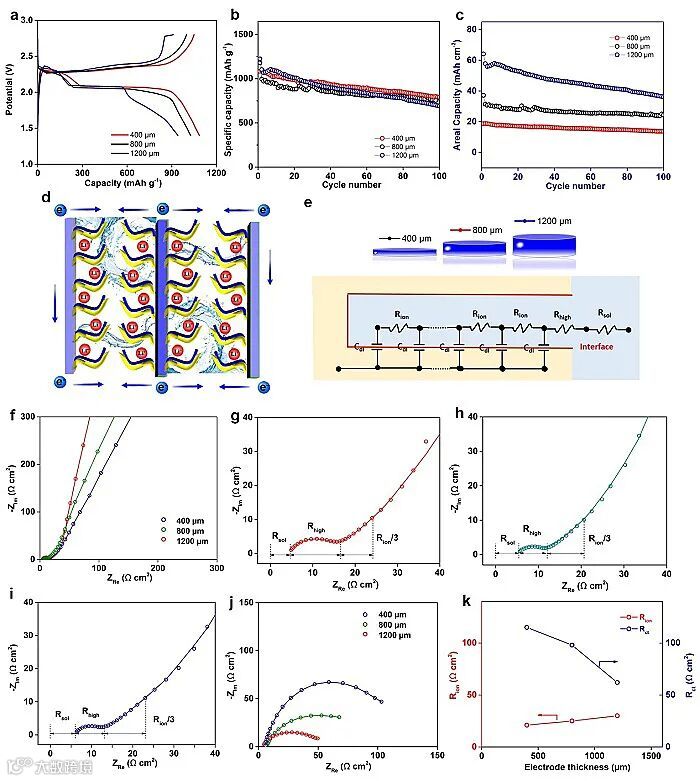 EIS测试分析表明S@WLC-CNTs电极没有显示出法拉第过程(0%SOC状态),而是由一个不规则的半圆、一条与实轴斜率为45°的直线和一条垂直线组成。它们的放大曲线如图2g-i所示,随着厚度的增加,电解质体积电阻Rsol和电解质与电极界面的离子/电子电阻(Rhigh)几乎相同。对于厚度为400、800和1200 μm的电极,计算出的Rion分别为21、25和30 Ω cm2,表明增加电极厚度对快速离子传输没有影响。为了研究它们的Rct,在SOC为50%时,对不同厚度的S@WLC-CNTs电极进行了EIS-SC测试。如图2j、k所示,Rct与电极厚度成反比,400 μm为120 Ω cm2,800 μm为85 Ω cm2,而1200 μm为52 Ω cm2。从电极的角度来看,增加电极的厚度相当于改变反应表面积和孔隙长度。因此,每单位活性表面积的电荷转移电阻(Rct,A)可以用来公平地比较不同厚度电极的电阻。它表示为Rct,A = 2πrLRct。其中r是电极的半径,L是厚度。根据我们的EIS-SC结果,Rct与电极厚度成反比,因此,不同厚度S@WLC-CNTs电极的Rct,A的值几乎相同。在这个体系中,随着电极厚度的变化,Rion和Rct,A几乎没有变化,这充分说明了它们的电化学性能与厚度无关。电化学测试分析也证实上述分析,如图2a所示,随着电极厚度的增加,S@WLC-CNTs的容量并没有发生显著的衰减。