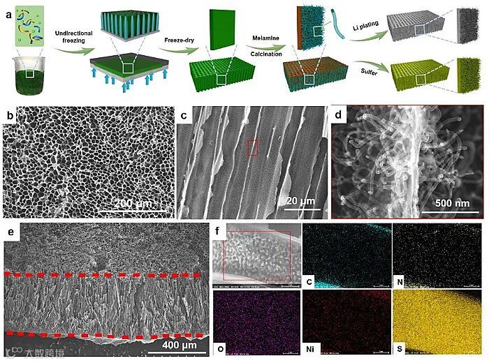 近日,美国德克萨斯大学奥斯汀分校余桂华教授与澳大利亚伍伦贡大学柏中朝和窦世学教授等合作利用冰模板法和催化尖端生长法制备了长有碳纳米管“森林”的木头状碳材料作为锂硫电池中硫的骨架材料。该材料具有高导电性和强壮的木头结构特征,因此它可以作为高载硫量硫的宿主(S@WLC-CNTs),而不需要集流体、导电添加剂和粘结剂。这种独特的S@WLC-CNTs电极材料具有低曲率的微通道,可以减少电荷(离子和电子)扩散路径,允许电解液在电极内部自由穿梭,并能缓解硫的体积变化。此外,碳纳米管“森林”通过非极性-极性相互作用和富电子特性,可以有效地捕获可溶性多硫化物,催化其在电极内部的氧化还原动力学。最重要的是,它是一个厚度无关的电极,因此硫的面负载量可以很容易地通过增加厚度来放大而不牺牲其电化学性能。当S@WLC-CNTs的厚度增加到1200 µm,硫的面负载量为52.4 mg cm-2,经过100圈循环,其容量仍可保持在692 mAh g−1。而且,WLC-CNTs还可以作为锂负极的主体材料(Li/WLC-CNTs)以抑制锂枝晶生长,表现出相当小的过电位和高的库仑效率。Li/WLC-CNTs和S@WLC-CNTs组装的Li−S全电池具有长循环稳定性,和极低的循环容量衰减率(0.057%)。本文对于理解高负载量锂硫电池具有重要意义,并能指导设计制备高载量高性能电极材料。这一成果近期发表在Nature Communications。