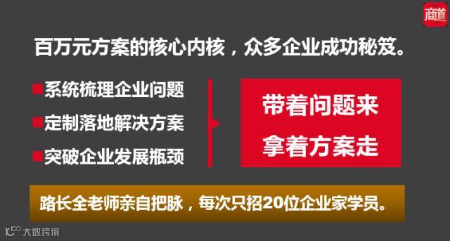 路长全营销策略咨询式提升班每次只招20位企业家学员,路长全老师亲自把脉,带你系统的梳理企业问题,现场定制落地解决方案,帮你突破企业发展瓶颈,实现企业跨越式的发展。