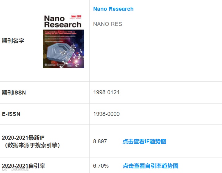IF:8.897;自引率:6.70%;国人占比:75.31%;领域:工程技术|化学材料,清华大学出版社和Springer联合发行;跨学科期刊,主要报道纳米科技研究领域的研究工作,在材料科学中是顶级期刊。