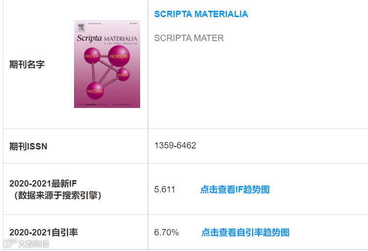 IF:5.611;国人占比:42.02%;自引率:6.70%;领域:材料综合 | 纳米科技 | 冶金工程。Scripta Materialia是冶金与金属材料领域的老牌期刊,虽然在材料综合和纳米科技这两个领域几乎没有什么竞争力,但在80本冶金期刊中排名第5。