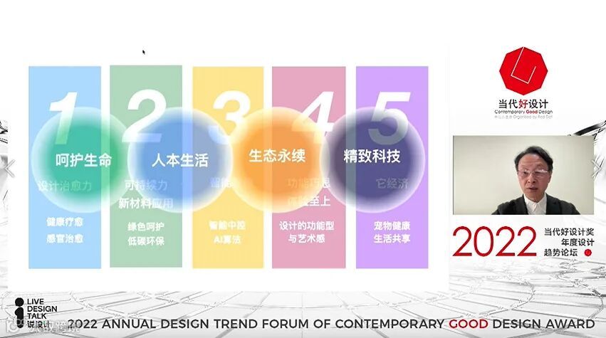 在2022当代好设计奖年度设计趋势论坛上,蔡军教授发布了当代好设计奖年度设计趋势分析,结合近年国际设计大奖趋势进行分析,得出精致科技、人本生活、呵护生命、生态永续的设计趋势观点。