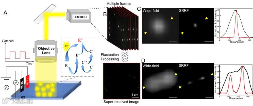电致化学发光(electrogenerated chemiluminescence,ECL)源于电化学反应电子传递过程中将电能转化为辐射能的过程。发光分子在电极表面经过氧化还原过程生成激发态,进而退激产生发光。电致化学发光显微镜(ECLM),结合电化学激发和光学读出的方式,具有低背景、无光热效应、高通量和可控性好等优点,可有效地弥补单颗粒、单细胞电化学分析中的不足,成为单颗粒电化学性能研究中一种创新性的技术手段。这种测量技术在能源领域及生命分析领域,具有卓越的应用前景。然而,作为一种光学成像技术,ECLM 受到衍射极限的影响,无法得到更精细的结构信息。因此,发展超分辨电致化学发光显微镜(Super-resolution ECLM),打破传统衍射极限,对于单颗粒和单细胞分析成像具有重要意义。
