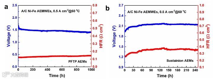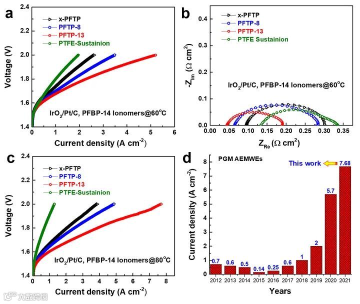 具有高水扩散系数以及离子传导率的碱性膜可以显著提高AEMWEs内部水和离子的渗透与传导,从而有效提高AEMWEs的电池性能。开发的贵金属型(PGM)AEMWEs在1 M KOH阳极、80 ℃下,电流密度达到7.68 A cm-2 @2.0 V(图3),该性能为目前AEMWEs报道的最高电流密度(大部分AEMWEs < 4 A cm-2@2.0 V),达到高性能PEMWEs(6 A cm-2@2.0 V)的水平。PGM-AEMWEs电池寿命可以在0.5 A cm-2下运行1000 h。